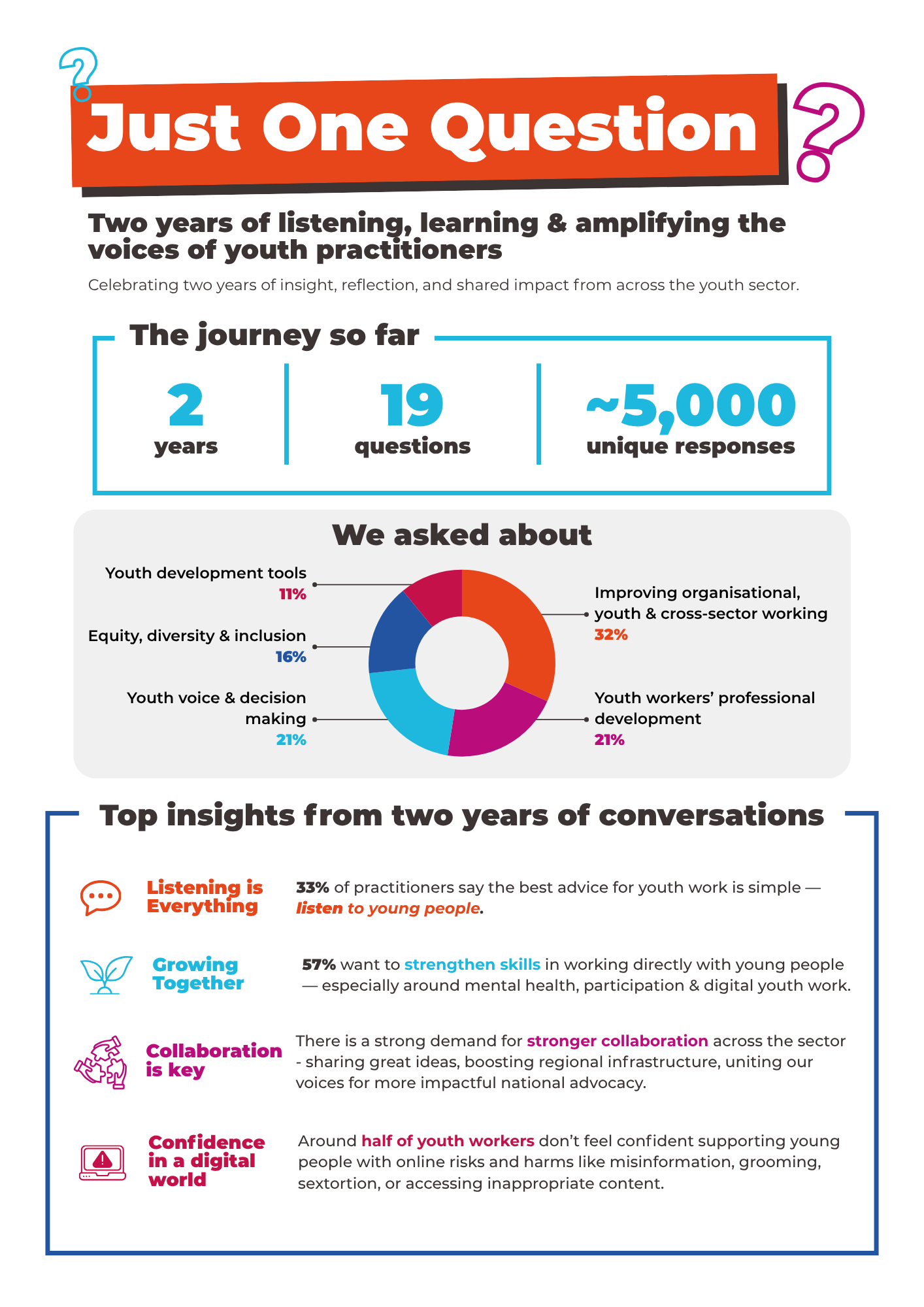 This November marks two years since the relaunch of Just One Question (JOQ), UK Youth’s monthly snapshot survey that amplifies the voices of youth workers across the UK. It has asked youth workers across the UK a single monthly question on topical issues for the youth sector.