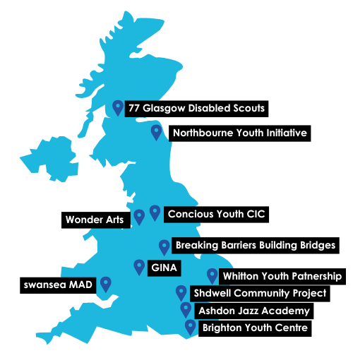 The map shows the organisations that received support, from mentoring and creative programmes to community-led initiatives, all strengthening local services and reaching more young people.