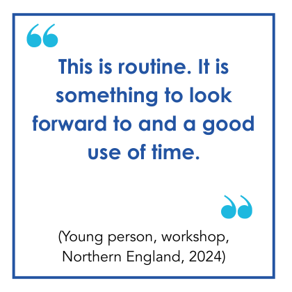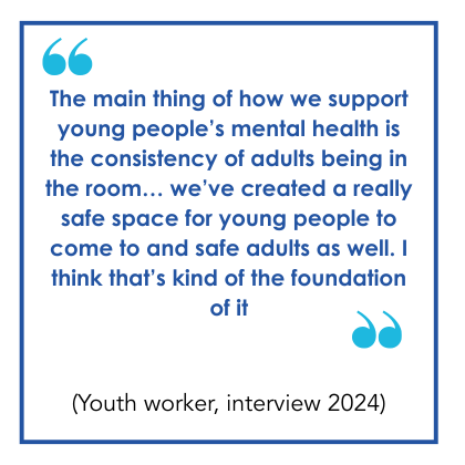 Building on prior research and practice within and beyond the Thriving Minds Fund, the assumption was that youth work plays a distinct and essential role in supporting young people’s mental health. This role has gained significance in light of the increasing rates of reported adolescent mental health challenges, despite extensive efforts to address these issues (Foulkes, 2023; Pierce et al 2025) primarily through individually focused statutory interventions (Clarke et al, 2021; Evans et al., 2024).